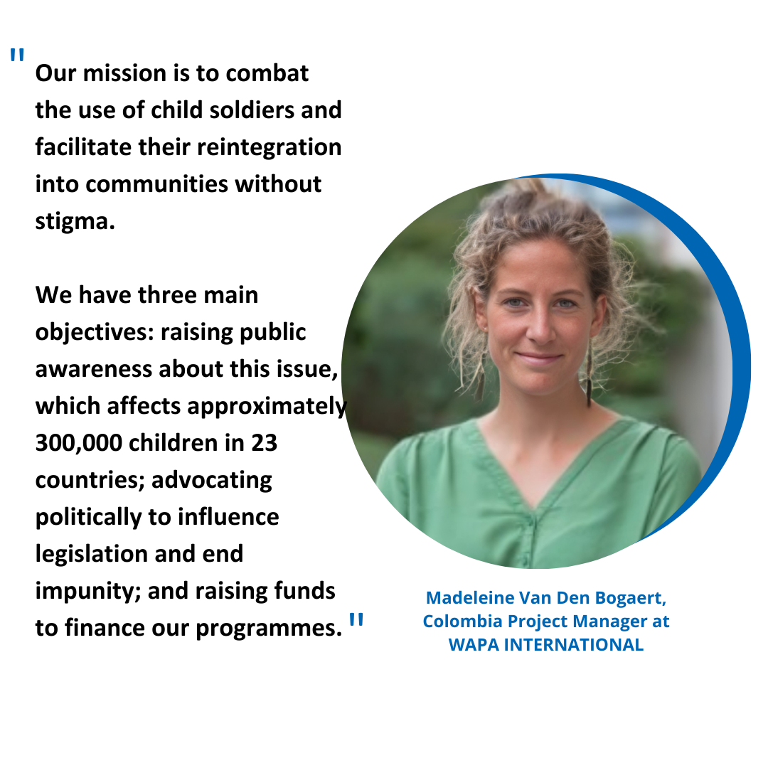 "Our mission is to combat the use of child soldiers and facilitate their reintegration into communities without stigmatization. We have three main goals: to raise public awareness about this issue that affects about 300,000 children in 23 countries, to exert political pressure to influence laws and end impunity, and to raise funds to finance our programs.