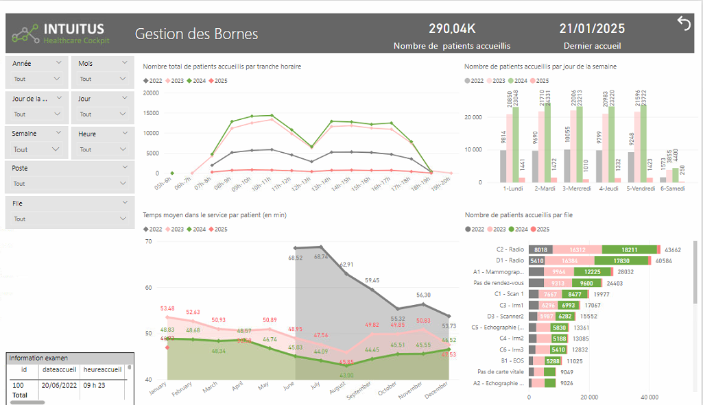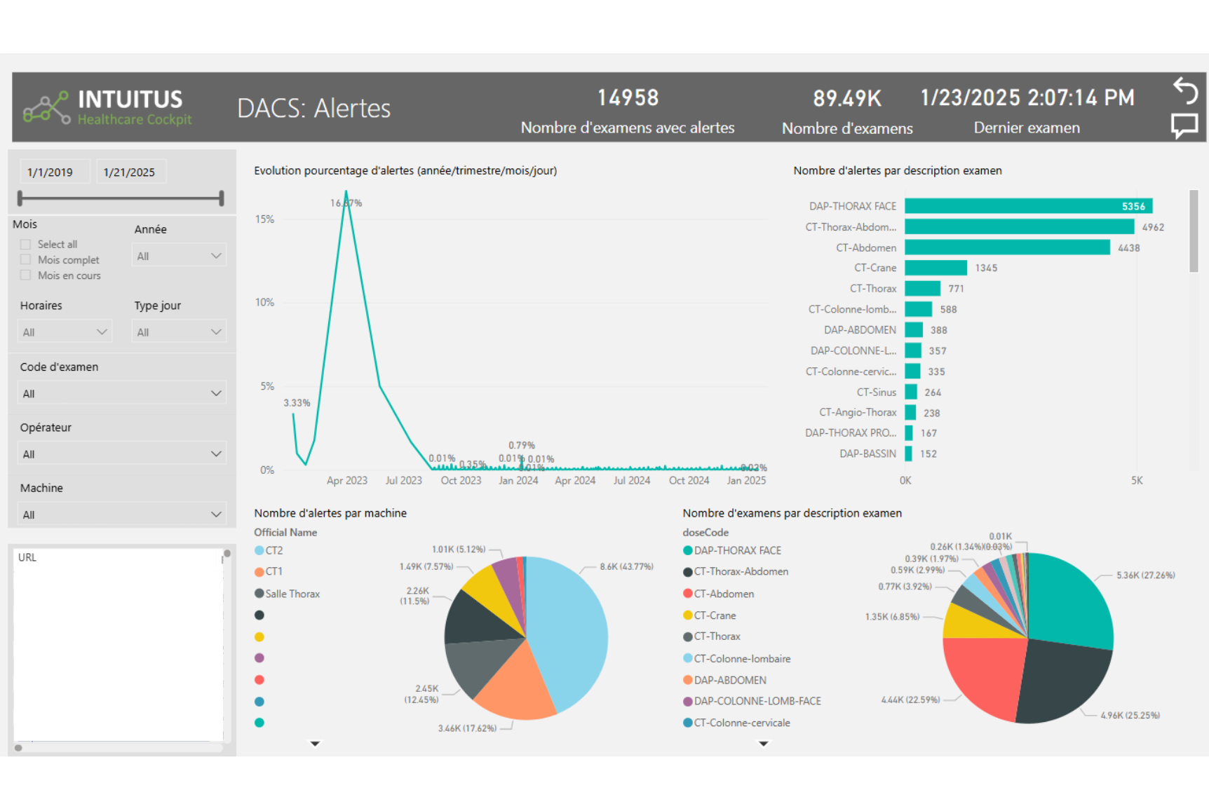 In 2024 hebben we nieuwe integraties gerealiseerd om aan de groeiende behoeften van onze gebruikers te voldoen. Het laboratoriumbeheersysteem MOLIS en het tariferingssysteem OPALE, evenals de beheersoftware voor de ontvangstbalies van het Franse bedrijf THERASOFT, zijn nu perfect geïntegreerd in INTUITUS. Deze strategische interconnecties maken optimaal gebruik van bestaande databanken mogelijk en bieden zo belangrijke indicatoren die onze gebruikers helpen om weloverwogen beslissingen te nemen en hun operationele prestaties te verbeteren.